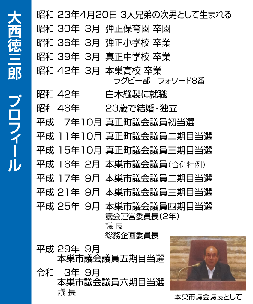 この節目に、いつも地域と対話し、長年培った政治経験と実績を「大西徳三郎の集大成」としてベテラン議員の視点を活かした具体的な政策を提案いたします。